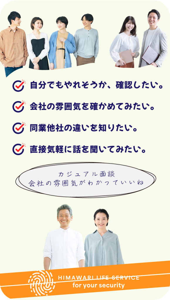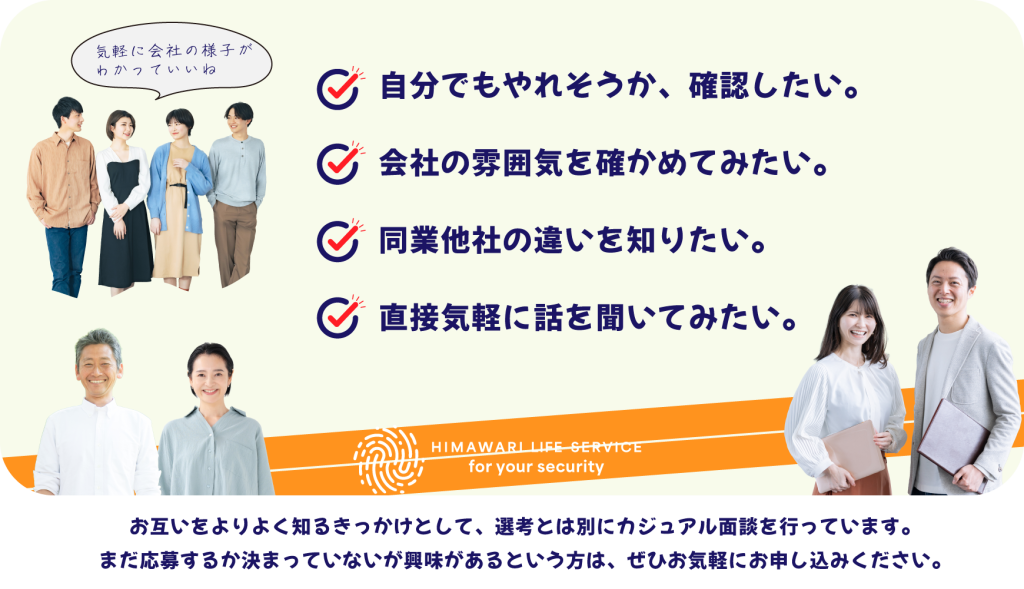 ひまわりライフサービスのことを気軽に知っていただけるよう、私服で気軽に参加いただけるカジュアル面談を行っています。もちろん無理な勧誘はしませんので安心してください。